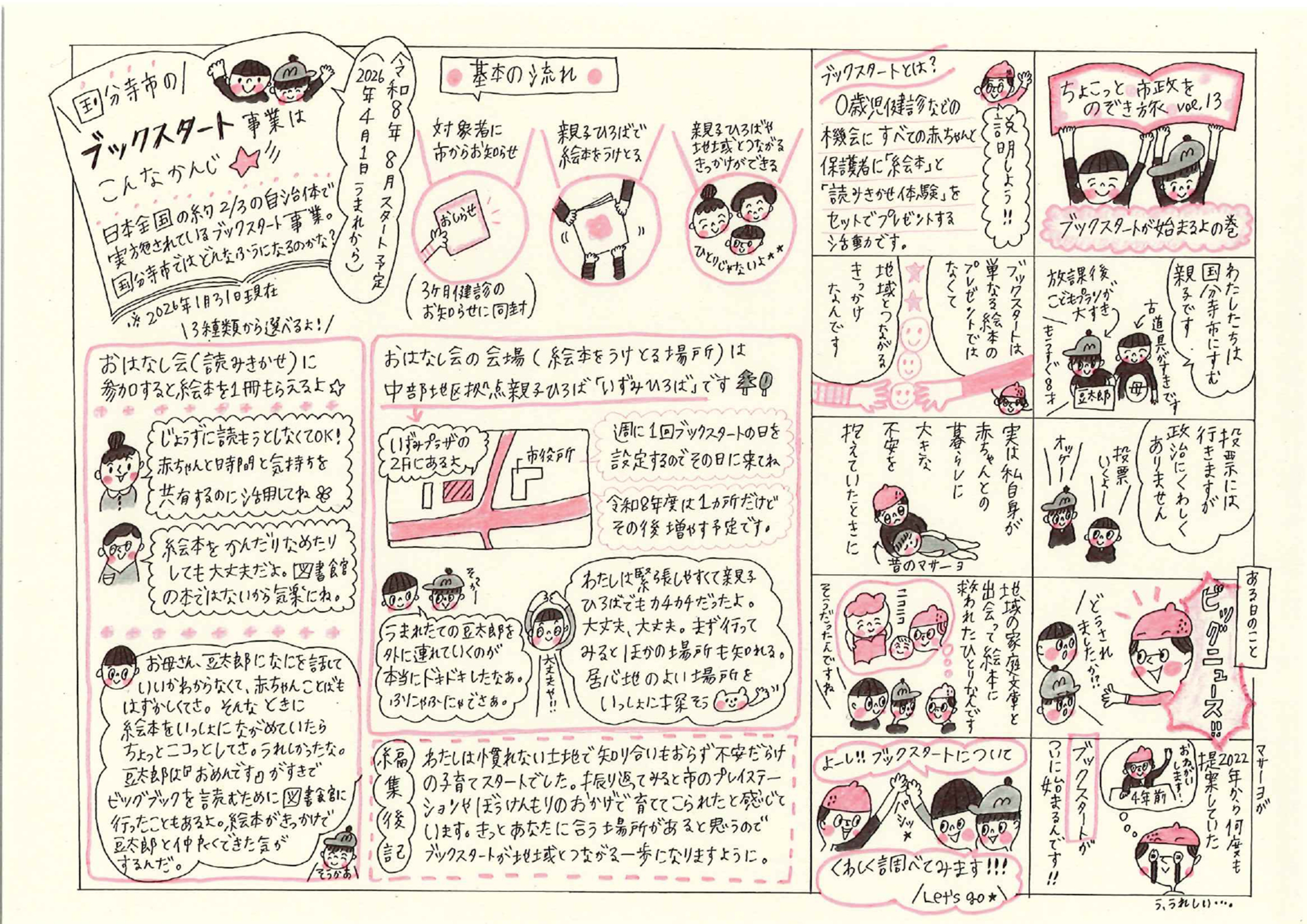 今回のタイトル面のテーマは代表質問です。そのほか評判のエッセイやおすすめ絵本等情報満載。イラスト面のテーマは「ブックスタートがはじまるよの巻」小坂まさ代が2022年から議会で何度も提案していた事業がついにスタート!! ということで豆太郎親子が取材しています。